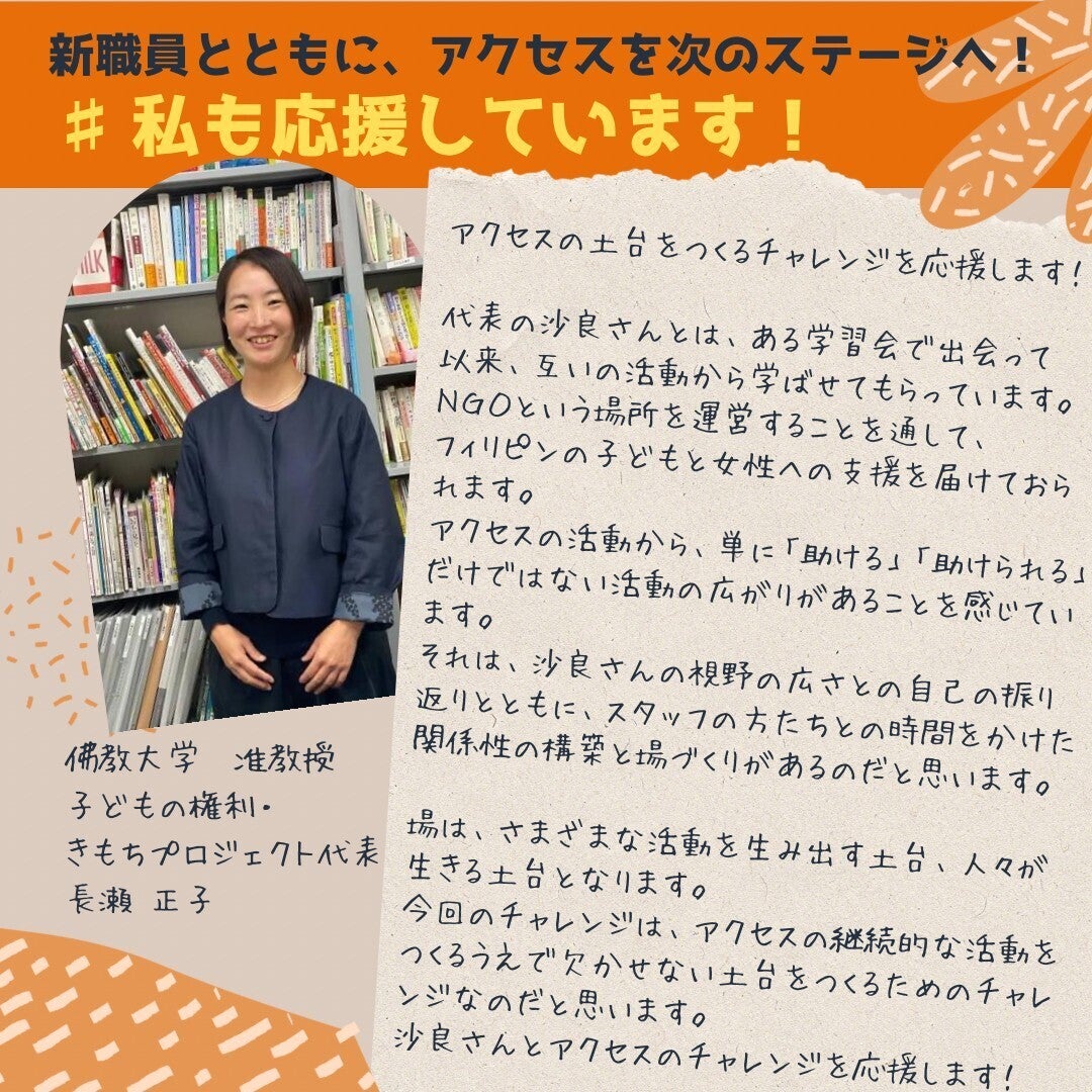 代表の沙良さんとは、ある学習会で出会って以来、互いの活動から学ばせてもらっています。NGOという場所を運営することを通して、フィリピンの子どもと女性への支援を届けておられます。アクセスの活動から、単に「助ける」「助けられる」だけではない活動の広がりがあることを感じています。それは、沙良さんの視野の広さとの自己の振り返りとともに、スタッフの方たちとの時間をかけた関係性の構築と場づくりがあるのだと思います。