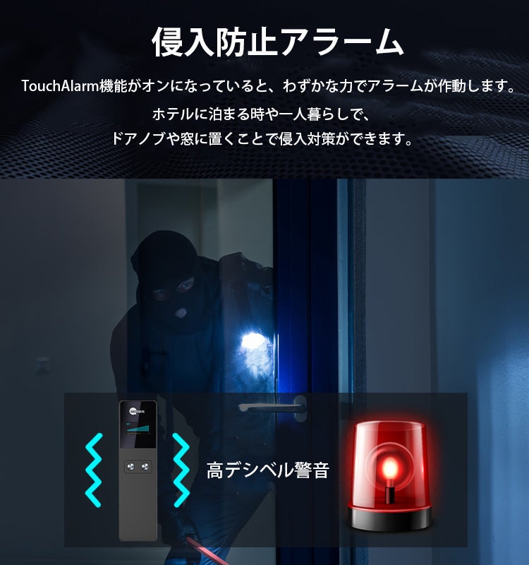 「KD60」は盗難/侵入防止アラーム機能を搭載しており。一人暮らしの方やホテルに泊まる際に非常に役に立ちます。