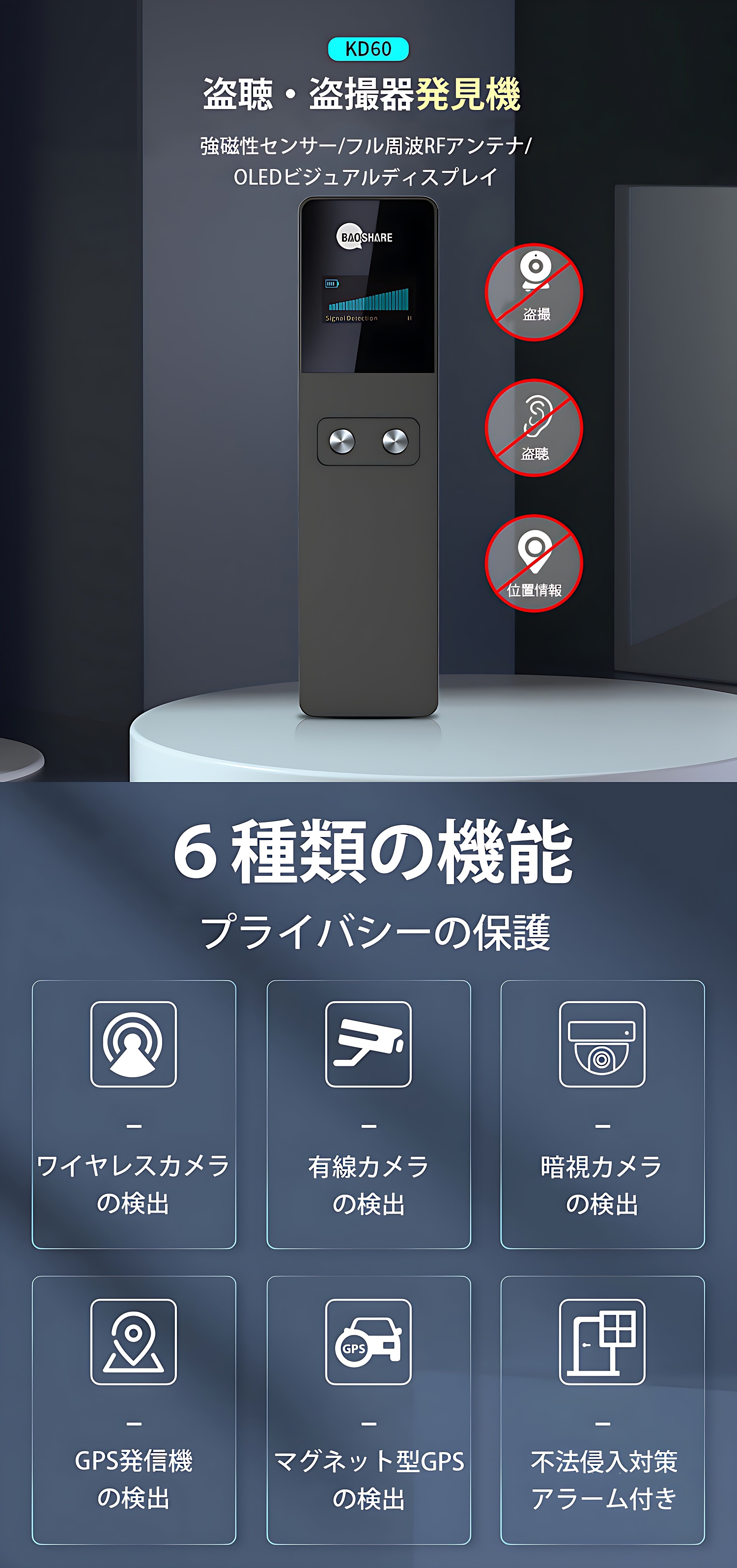 GPS、Wi-Fi、ワイヤレスWi-Fiカメラ、Webカメラ、無線盗聴器、GPSロケータ、これらの信号は全て検出可能です。