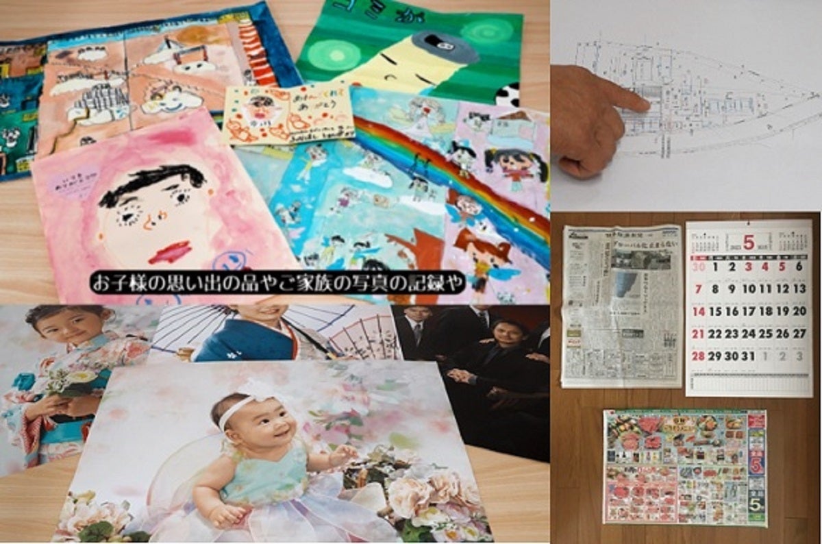 思い出の品, 大判写真, 絵画, ポスター, 図面, 新聞紙(1ページ分), チラシ, カレンダーなどです。