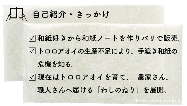 ノートを欧州で販売するなかで、自然から作られた日本の伝統工芸に対し、海外の方の方が価値を認めていることに気づかされ、和紙の原料をたどることになりました。