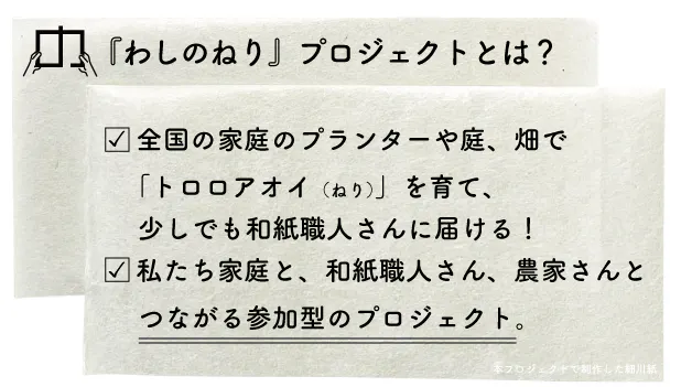 今回の「わしのねり」は3年目となり、農家さん、紙漉き職人さん、消費者がつながる伝統工芸のこれからのモデルとなり、自然をとりこむ同化感覚を持つ日本だからできる持続可能な社会に向けて、新しい循環の仕組みづくりに向けて確実に歩んでいると実感しています。 ぜひ、一緒に楽しんで「ねり(トロロアオイ)」を育ててみませんか。和紙に触れてみませんか。