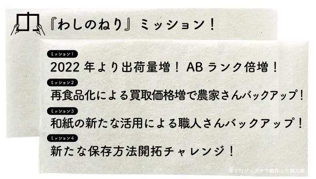 また、和紙の活用では、長野県にある小諸市にて寺社と連携し、寺社でトロロアオイを育てていただき、そのトロロアオイで御朱印や御札をつくる取り組みもはじめていきます。