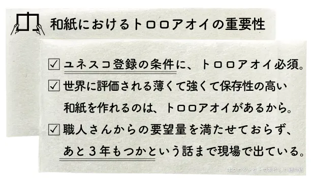 そこで知ったのが、トロロアオイの生産不足による手漉き和紙存続の危機。