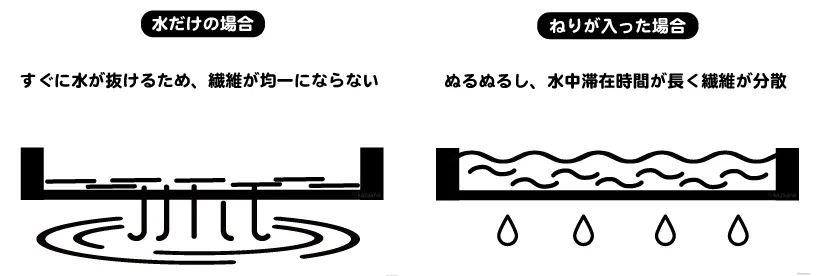 『ねり』を使うと水中で繊維をコーティングし、均等に分散して浮遊させます。