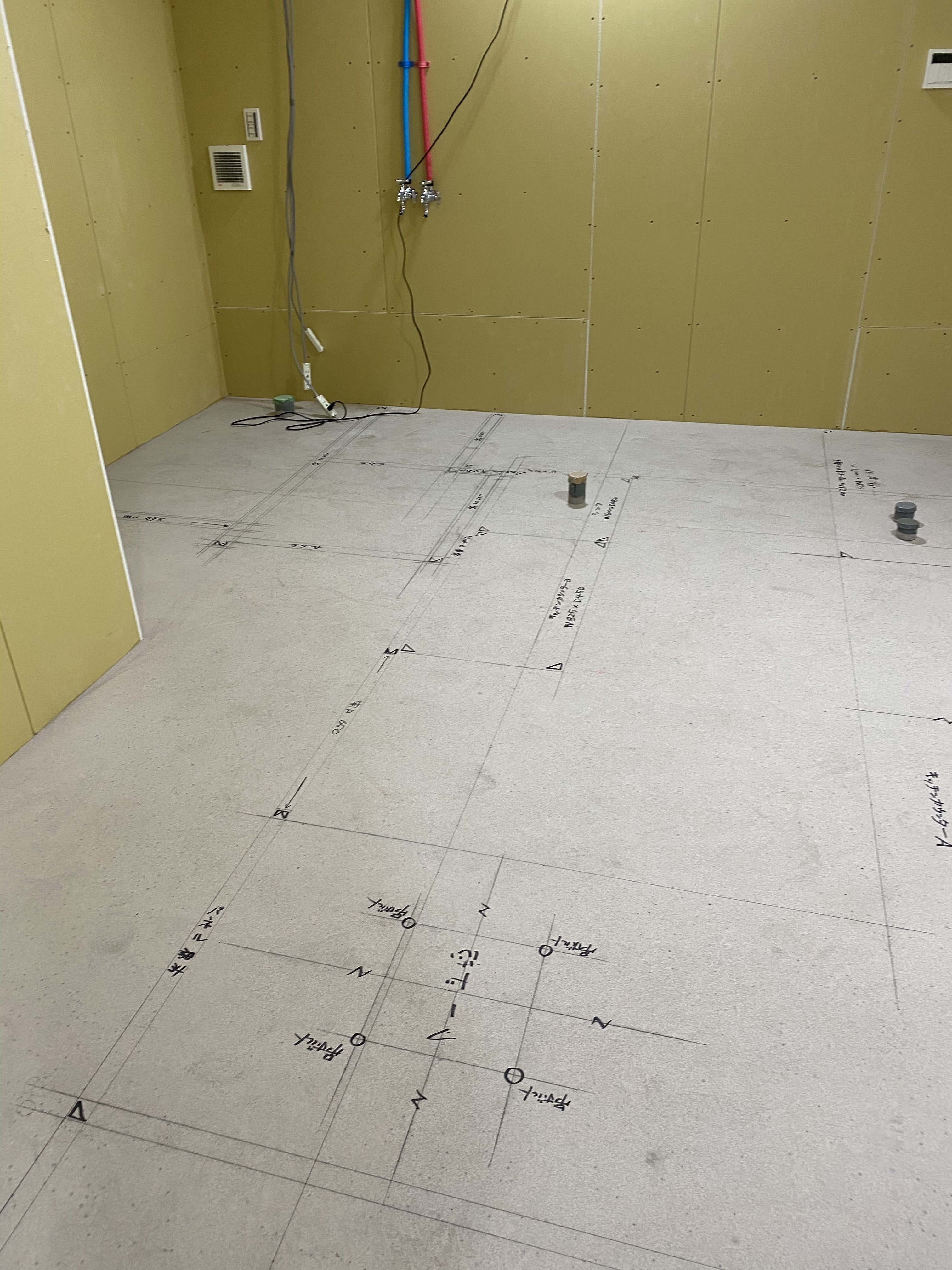 工事の最初は「墨出し」↓という床に線を書く事から始まるそうです