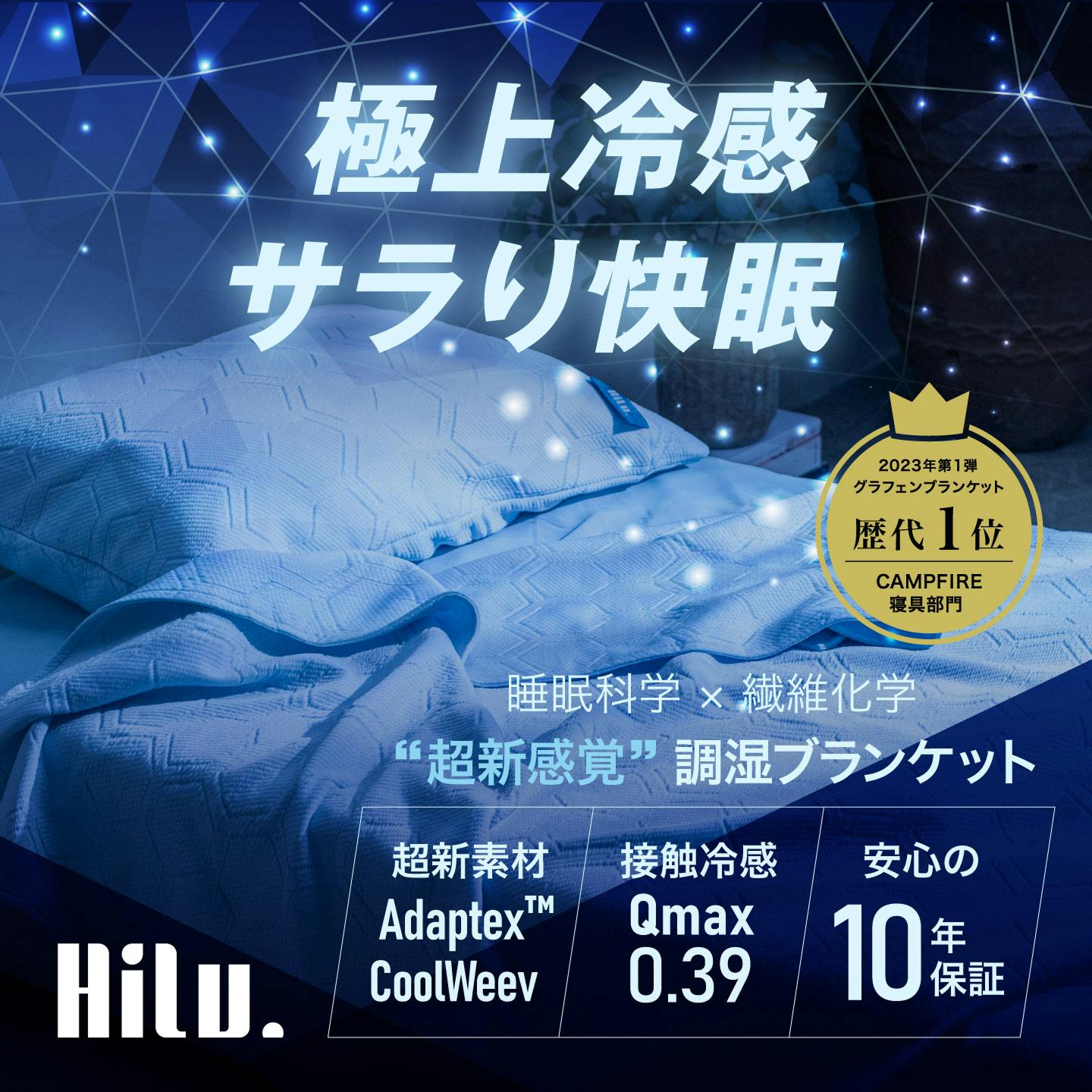 HILU Bluvetは、先端繊維テクノロジー「Adaptex CoolWeev™」を使用。この高耐久素材は、10年間使用しても冷感機能やサラサラの手触りが持続します。
