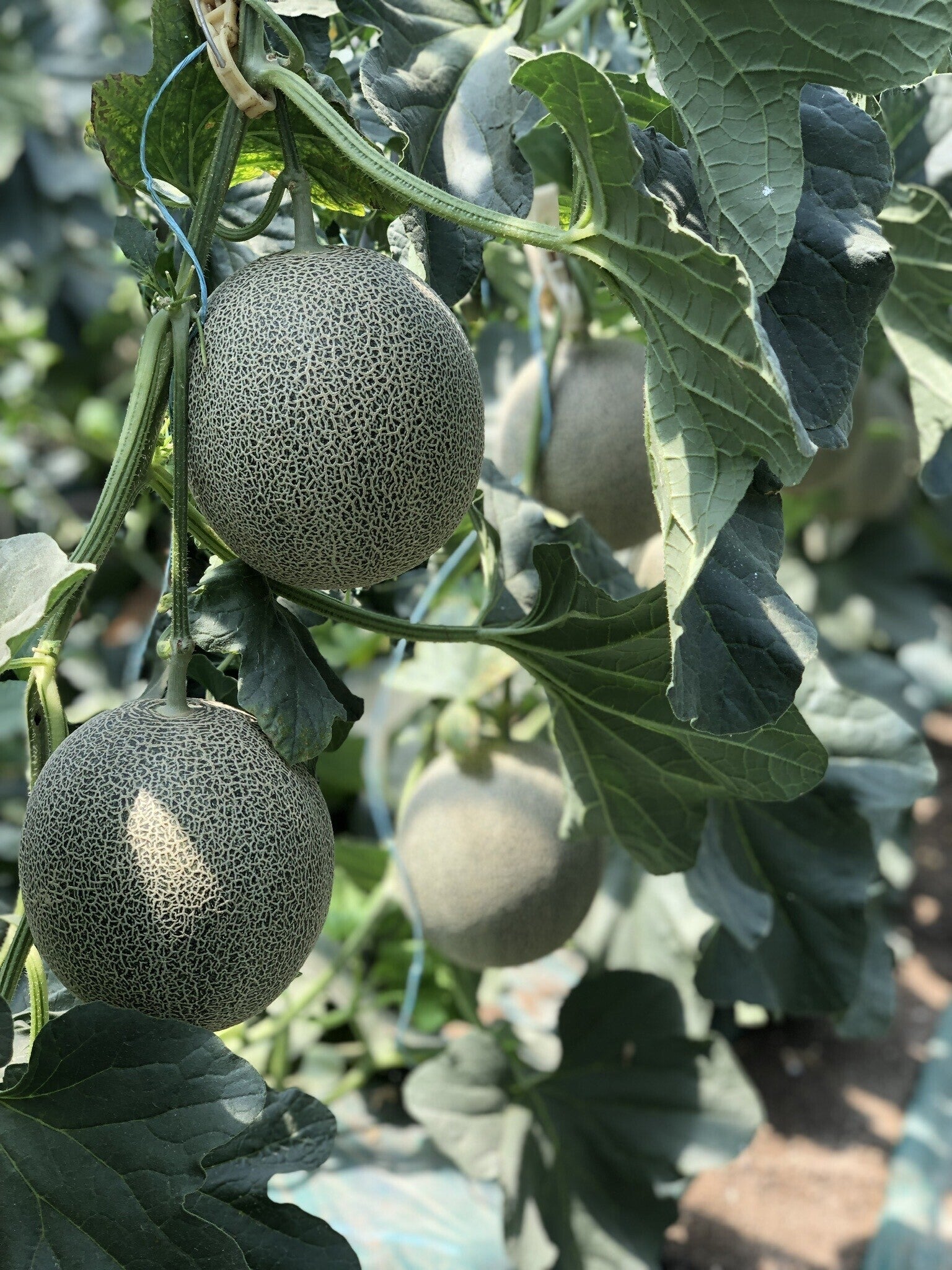 全てのメロンの成る位置を合わせて、果実の枝以外の芽を摘み取り果実に栄養が行くよう栽培して おります。2番果、3番果は着けないで1番果のみに栄養が行くよう完全管理での栽培をしております。