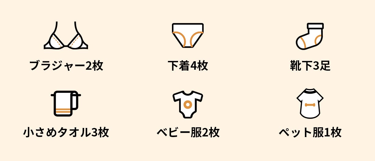 ベット服は約1枚、下着は約4枚、靴下約3足は洗うことが可能です。