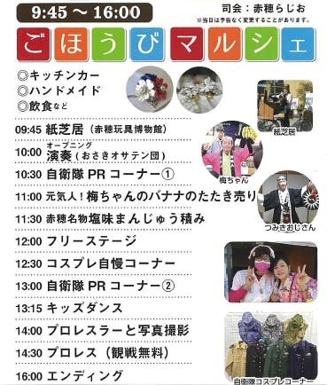 色とりどりのコスチューム、アニメや好きなキャラクターになりきって、異世界に旅したような不思議な感覚を体験してください。今回は赤穂城内武家屋敷公園にて丹波プロレスと自衛隊に来て頂き、本物のリングの上でくり広げられるエンターテインメントをお楽しみ頂けます。ちょっぴり恥ずかしいわ。と思う方も、是非この機会にコスプレの世界をご覧ください。