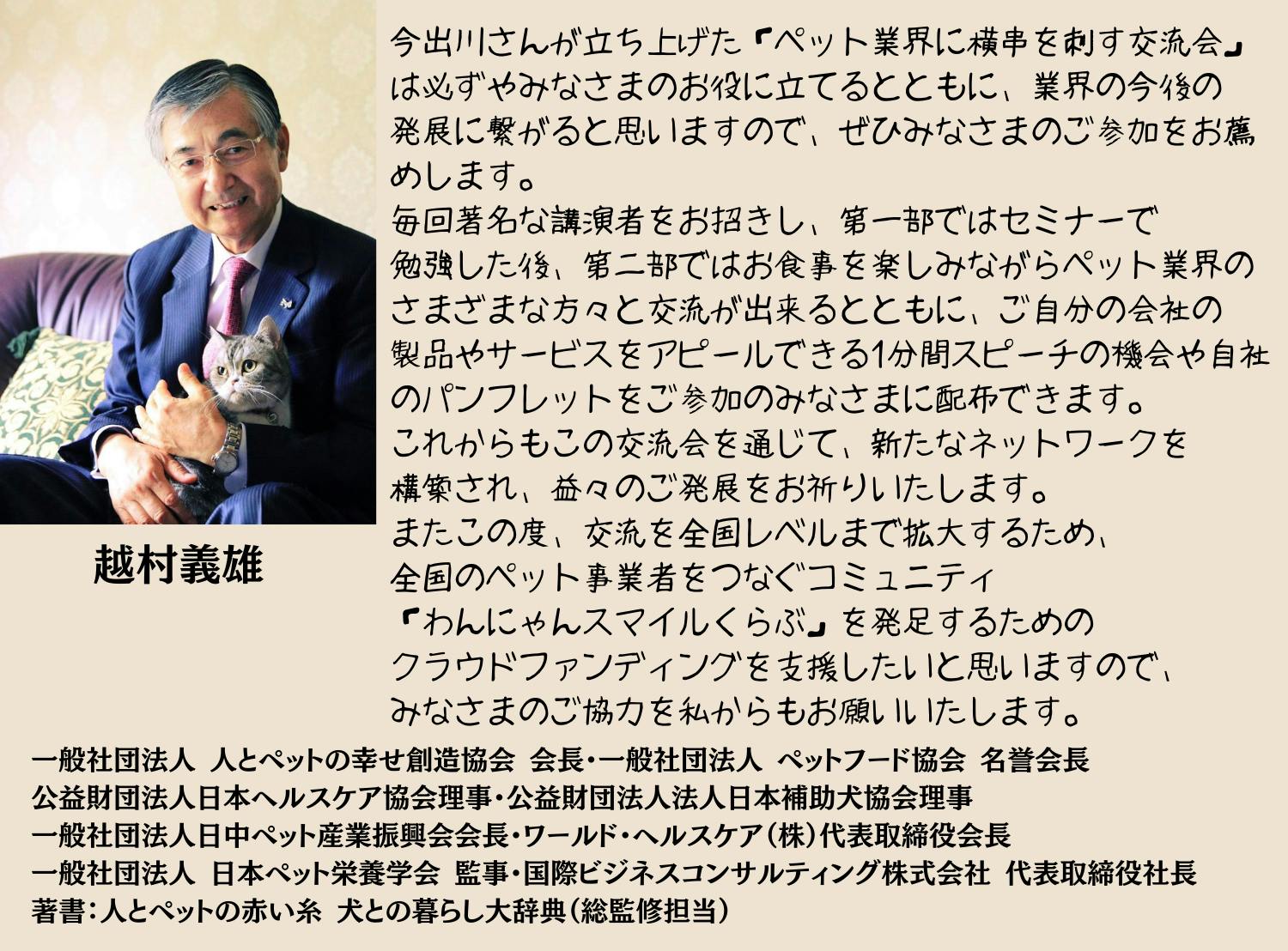 また、一般社団法人人とペットの幸せ創造協会会長、一般社団法人ペットフード協会名誉会長、一般社団法人日中ペット産業振興会会長の越村義雄先生には毎回ご参加いただき、このコミュニティをバックアップしていただいています。