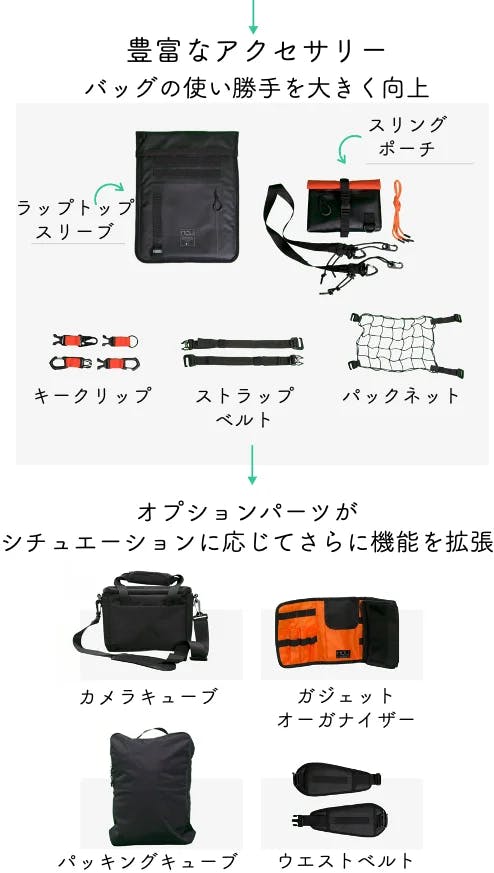 バッグ本体に接続可能なオプションを活用することで、用途の拡張性は無限大になります。