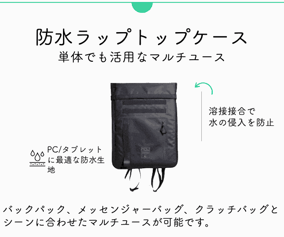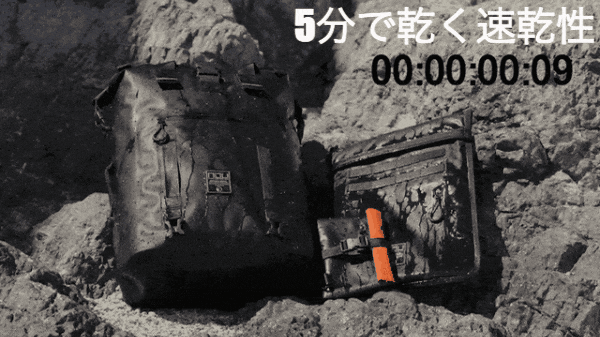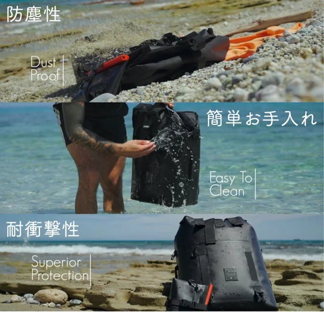 ※止水ジップと、縫い目の無い溶接接合で高い防水性を実現致しましたが、ご使用方法によってはファスナーの隙間から水が侵入することがございます。電子機器などを収納しご使用される際は、海などに沈めないようご注意ください。