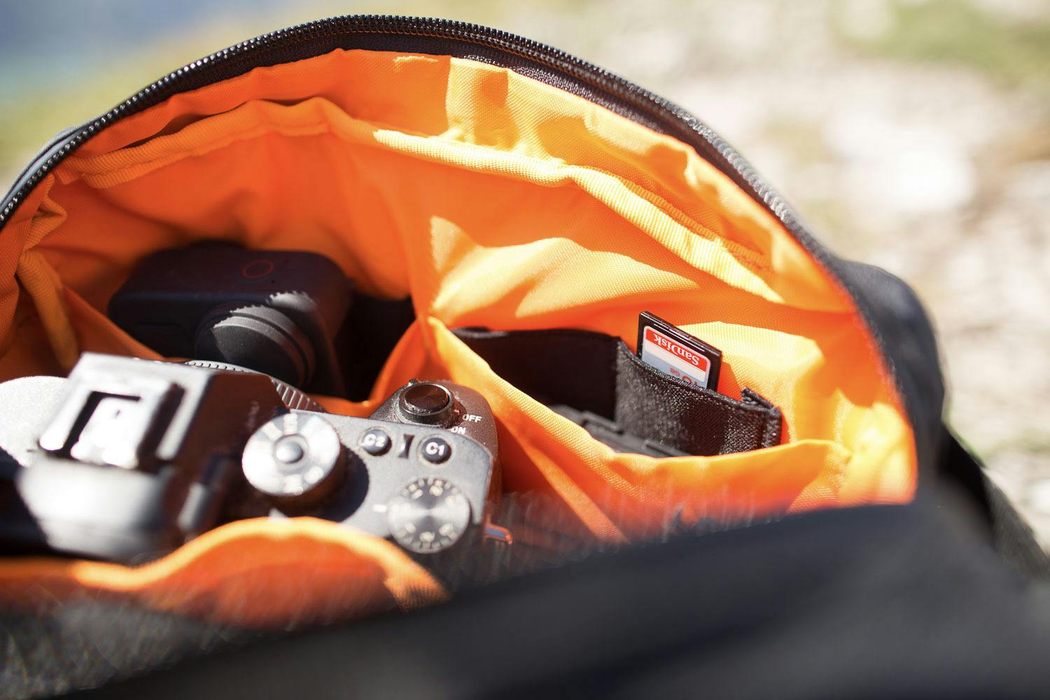 A:小型のカメラやドローン、ジンバルなどガジェット収納に最適な設計となっています。