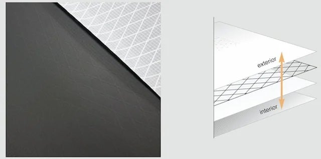 X-Pacの中間層にある「X-PLY」は、ポリエステルの繊維を撚った強力な紐をX状に交差するように組み合わせることで、高い引き裂き強度を実現。織物の弱点とも言われる斜め方向の伸びを抑える力があります。