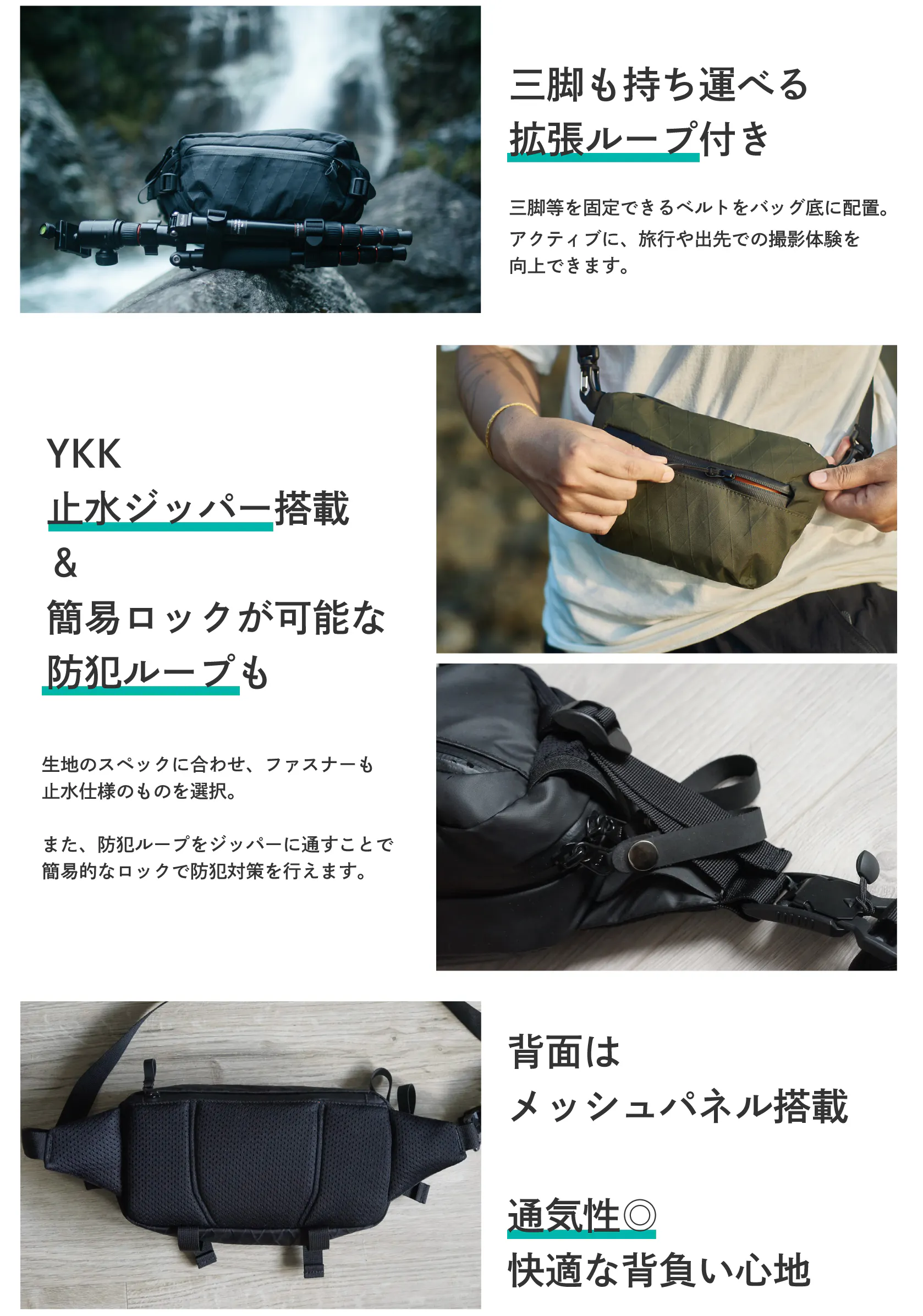 スリングバッグとウエストポーチの2way仕様をはじめ、徹底した素材選びと内部の作り込みにより、カメラ・ガジェット用バッグの決定版とも言える製品が誕生いたしました。