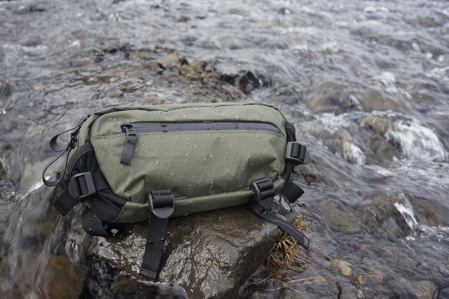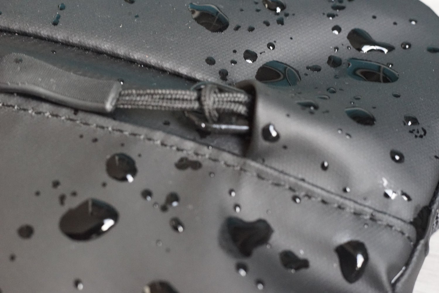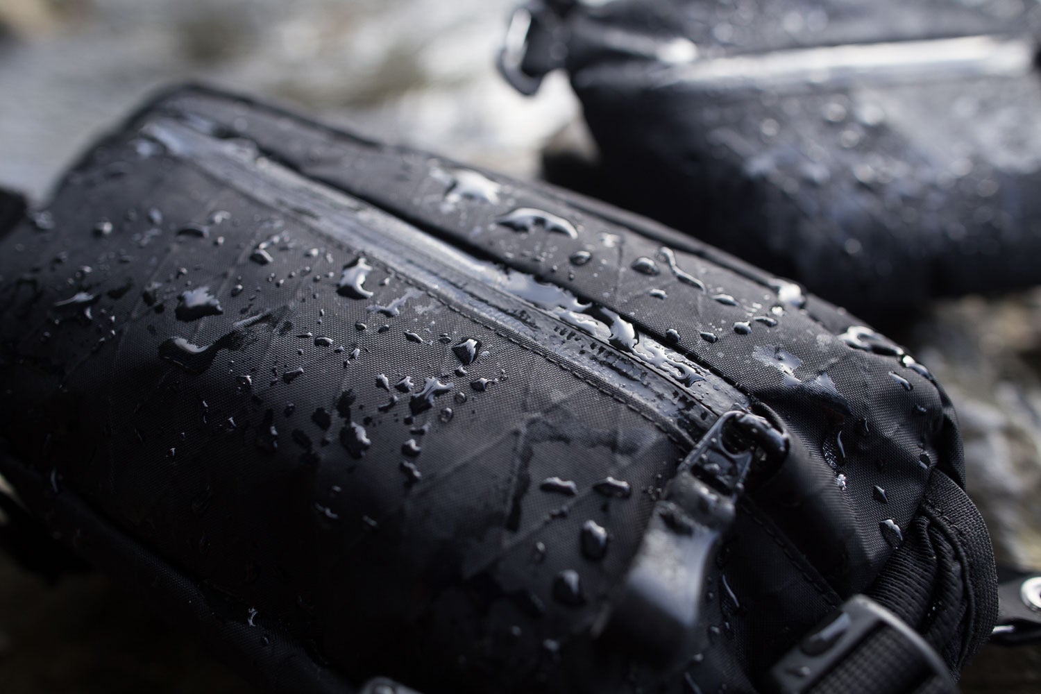 A:バッグの素材である、420Dの高品質ナイロンの生地、さらに強固な4層構造のX-Pacは水に強く、また、ファスナーもYKK止水ジッパーを使用しているため雨やアウトドアの環境にも最適です。