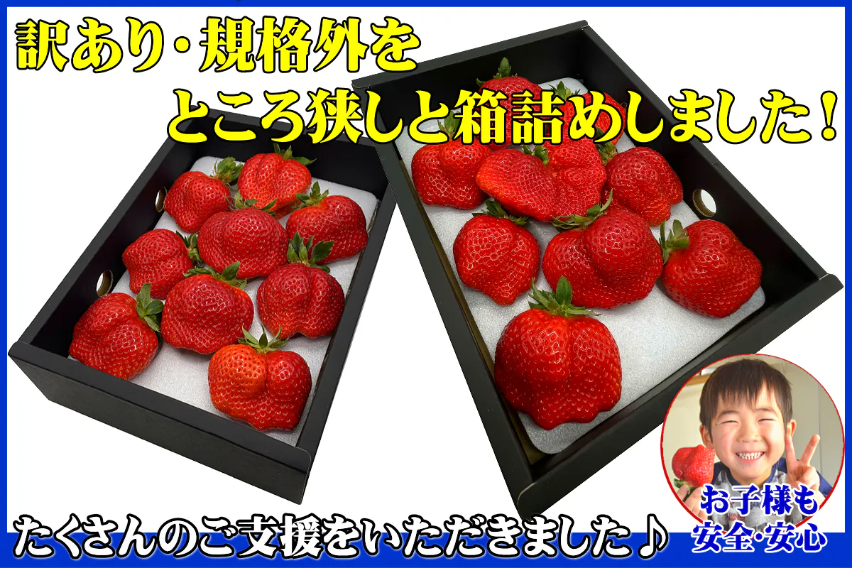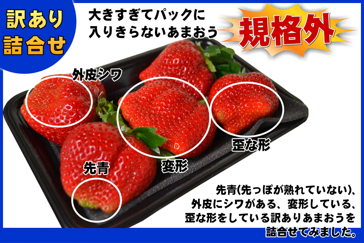 少し形が悪いだけの規格外!味はそのまま、たっぷり満足のあまおうを食べていただきたい♪