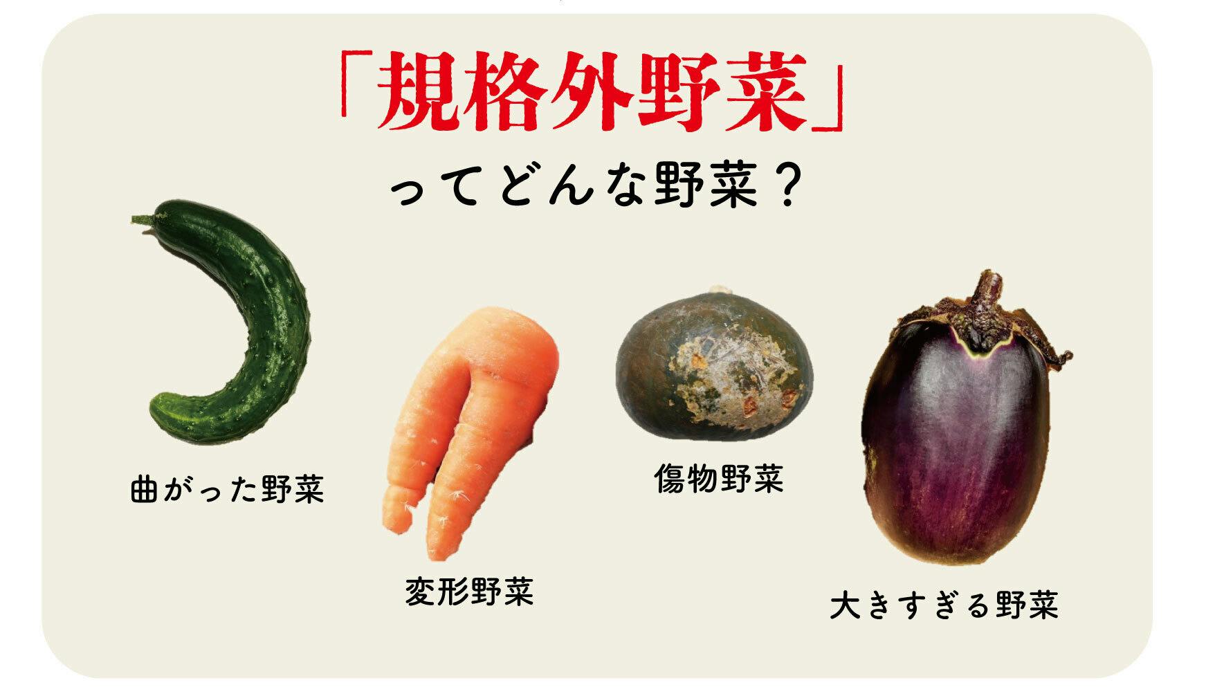 『規格外野菜』とは曲がっている、変形している、傷物である、大きすぎる、小さすぎるなど大きさや色、形、品質などが規格に適合しない野菜のことです。