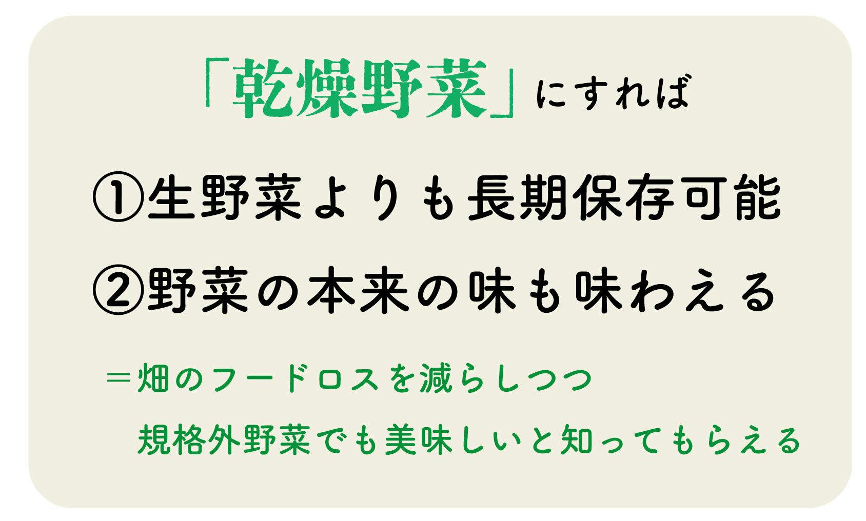 私たちはこの『出荷されず廃棄されてしまうお野菜』をどうにかできないかと思い、この『乾燥野菜』のプロジェクトを立ち上げました。