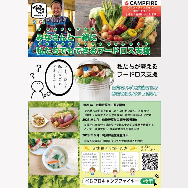 畑で発生するフードロスを真剣に考えて、乾燥野菜の作りを就労支援で活用した取り組みを行い、畑のフードロス活動と乾燥野菜の長期保存化、就労支援について。 農業での小規模農家さん、中規模農家さんが愛情込めて育てた野菜が収穫時や形が悪いなど市場ニーズの変動により、味は変わらず、食べられる野菜の一部がロスとなることがございます。食べれる野菜の有効活用する手段として、乾燥野菜の製造を選びました。 ロス野菜の選択別、収穫後、外観が考慮された野菜は通常の販売には適さないため破棄されるものが多くそのお野菜を乾燥野菜の製造で長期保存にし、尚且つ加工には就労者さんのお仕事へと取り組んでいます。どうかより多くの畑のロスがなくなりますよう、これからも皆様のお力添えをよろしくお願いいたします。残り8日!必ず成功させて良い報告をさせていただきますので、皆様どうか引き続きご支援、多くの方へこのプロジェクトを知っていただくために拡散をよろしくお願いいたします。
