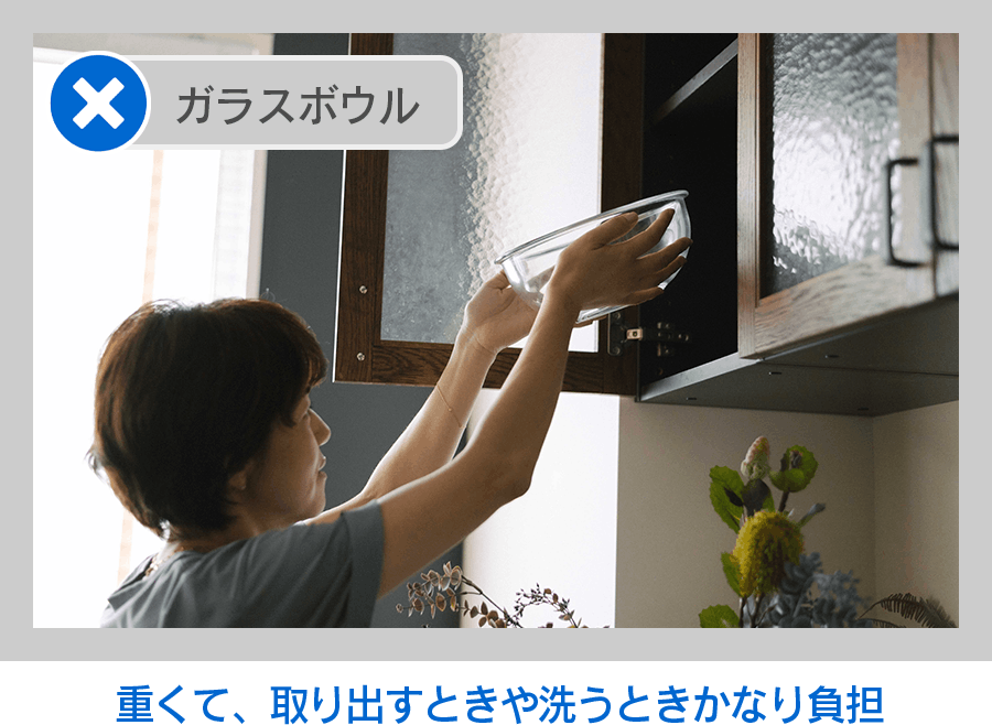 プラスチックボウルは軽いですが、傷ついたり熱で変形します。ガラスボウルはレンジにも使えますが、重い上に割れる心配があります。