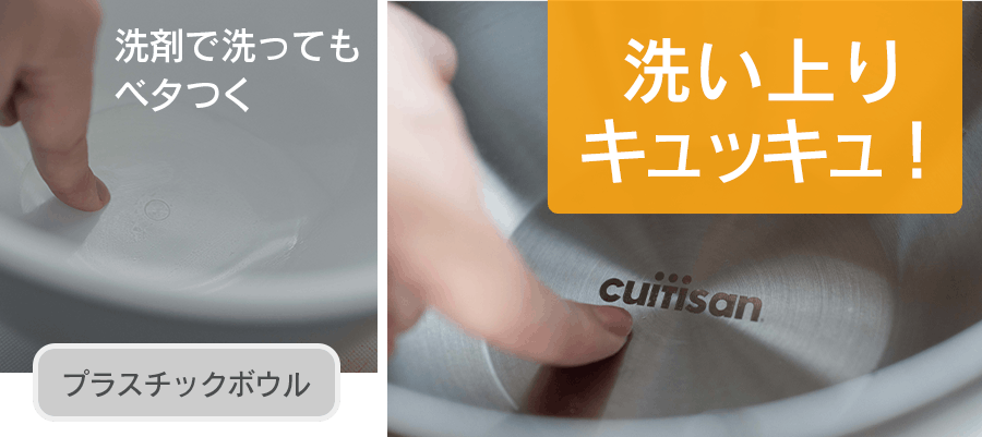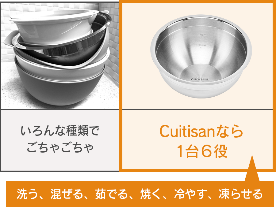 その点、Cuitisanボウルは、レンジ・オーブン・食洗器対応、軽くて扱いやすく、抗菌仕様で衛生的、さらに丈夫で長持ちなので、キッチンの相棒としてまさに一生もののステンレスボウル。1つで6つの機能がある言わば6刀流のボウルです!
