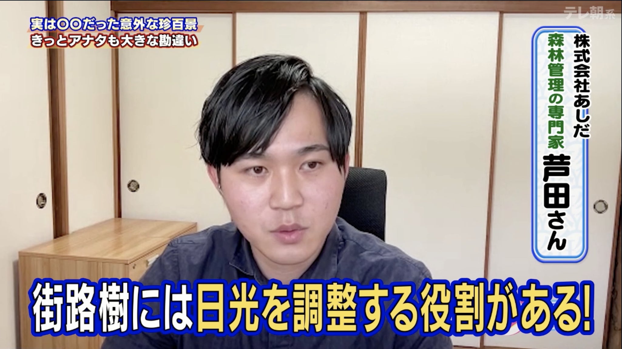 追記:Woodyニュースを見てのご連絡で2023年3月5日にテレビ朝日さんのナニコレ珍百景の「実は〇〇だった珍百景〜街路樹に落葉樹が多い理由」のコーナーに出演させていただきました。ある一文コメントのみの撮影でしたが、緊張でtake5ものお手間をかけました。