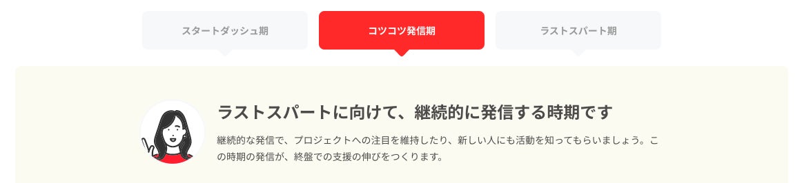 CAMPFIREのプラットフォーム上では、この時期を『コツコツ』期と位置付けているようです。