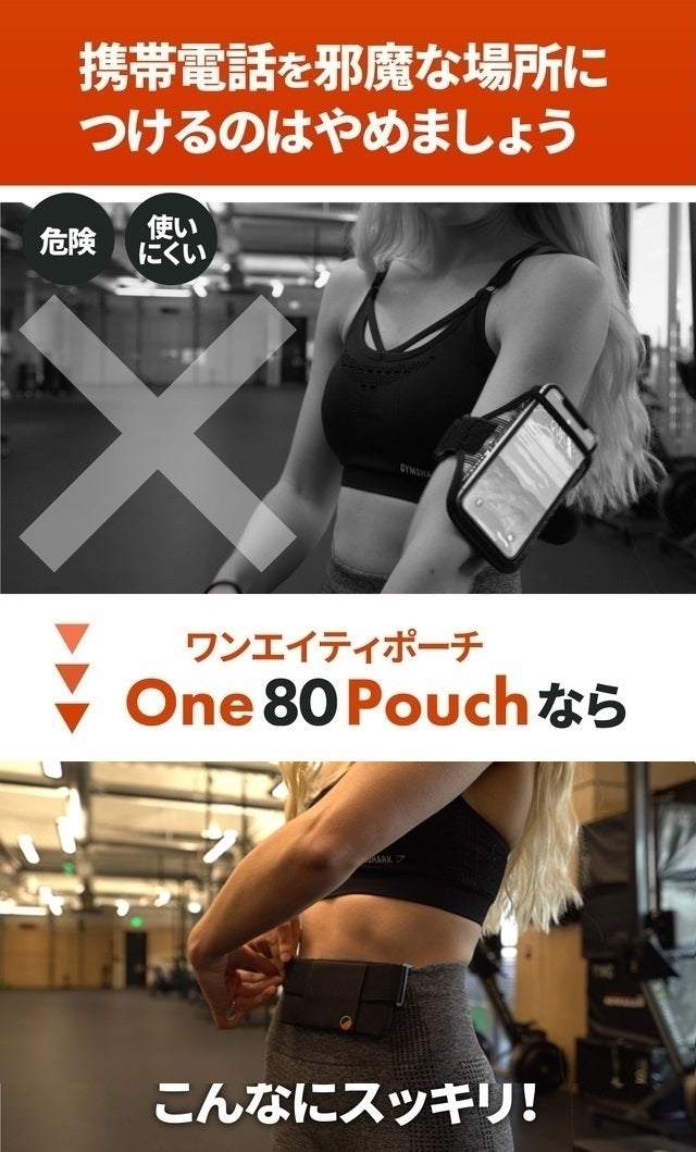 One80 Pouchは、ベルトやポケット・マグネット・マジックテープなどを使わないウエストラインに付けるだけの自立型ポーチ。 スマートフォンを持ち歩くためのランニングベルトに、新しいアイデアをプラスして財布やパスポートフォルダーへと展開。