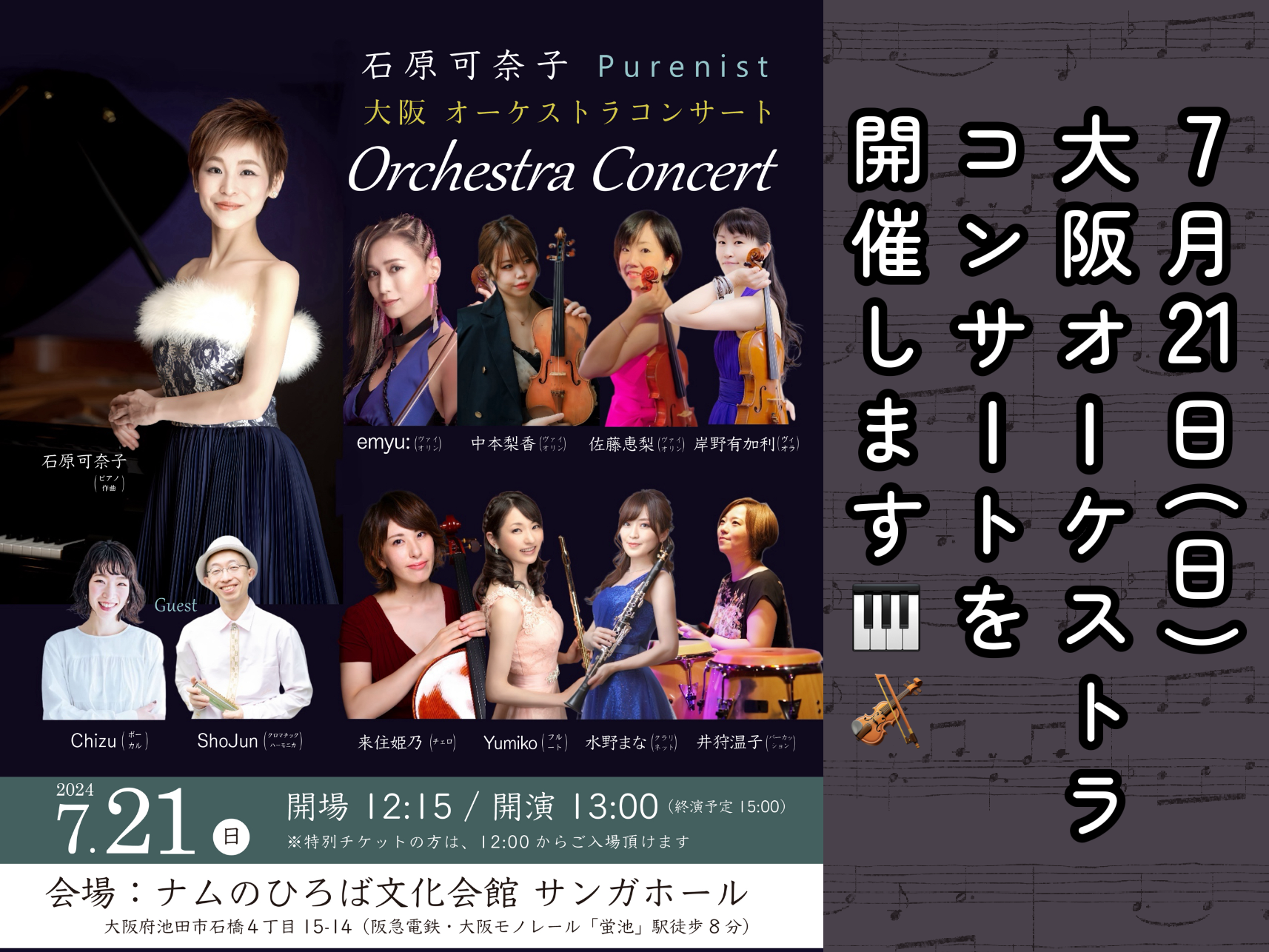 2024/07/06 15:15【今月21日、大阪でオーケストラコンサートを開催します!】皆様、ご無沙汰しております。暑い日々が続いておりますが、お元気でいらっしゃいますでしょうか。昨年は、東京でのオーケストラコンサートにご支援下さり、誠にありがとうございました。その7/22から約1年、今年は7/21に大阪でオーケストラコンサートを開催いたします!初めての大阪でのオーケストラコンサートまで、あと15日。ワクワクしながら準備しております。チケット発売中です。今回は、3種類のチケットがございまして、協賛プランは本日7/6締め切りになっております。ぜひ、ご検討頂けましたら幸いです。素敵なオーケストラ&ゲスト出演のメンバーと、お待ちしております♪下記、詳細です。【石原可奈子 大阪オーケストラコンサー】日時:2024年7月21日(日)開場:12:15/開演 13:00会場:ナムのひろば文化会館 サンガホールhttp://namosquare.org/大阪府池田市石橋4-15-14 正福寺内(阪急電鉄・大阪モノレール「蛍池」駅徒歩8分)《チケットサイト》https://tiget.net/events/298043チケット:特別チケット 10,000円(特別グッズ付き、開場15分前より入場可能)、一般チケット 4,500円、協賛プラン 1口 20,000円(特別チケット1枚付き、プログラムにお名前掲載)※後半に詳細を記載しています出演:石原可奈子(ピアノ)、emyu:(ヴァイオリン)、中本梨香(ヴァイオリン)、佐藤恵梨(ヴァイオリン)、岸野有加利(ヴィオラ)、来住姫乃(チェロ)、Yumiko(フルート)、水野まな(クラリネット)、井狩温子(パーカッション)ゲスト出演:Chizu(ボーカル)、ShoJun(クロマチックハーモニカ)※電子チケットは、TIGETのサイトにて事前決済となります。当日は、受付にて、受付完了メールの画面またはプリントアウトしたものをご提示下さい(紙のチケットは発券されません)。※当日は、ご来場頂いた順に整列頂き、ご入場となります。※特別チケットの方は、開場時刻の15分前よりご入場頂けます(12時から入場可能)。その際も、ご来場頂いた順にご入場となります。《協賛プランについて》※ご検討下さいます方は必ずお読み下さい※協賛プランは、1口につき、特別チケットが1枚つきます(特別グッズ付き、開場15分前より入場可能)。また、プログラムにお名前を掲載致します。※備考欄に、プログラムに掲載するご希望の表記を必ずご入力下さい(本名、会社名、ハンドルネームなど)。ご入力がない場合は掲載できません。なお、1口につきお一人分掲載できます。※掲載にあたりご確認が必要な事項があります場合、ご連絡させて頂く可能性がございます。※ライブには行けないけれど協賛プランを申し込みたい・匿名で協賛プランを申し込みたい等も有難く承ります。備考欄にご希望をご入力下さい。プログラムと特別グッズは、後日郵送致します。※協賛プランは、プログラム印刷のスケジュール上、7/6で締め切ります。※お客様のご都合によるキャンセル、返金はできませんのでご了承下さい。※ご不明な点がございましたら purenistlive@gmail.com までご連絡下さい。お会いできましたら幸いです(^^)暑さ厳しい毎日ですが、どうぞご自愛下さいませ。“ピュアニスト” 石原可奈子《昨年の東京オーケストラコンサートのDVD-R、通販サイトで販売中です》・昼公演〜ピアノソロhttps://purenist.theshop.jp/items/79400318・夜公演〜オーケストラ&ピアノhttps://purenist.theshop.jp/items/79400442 もっと見る