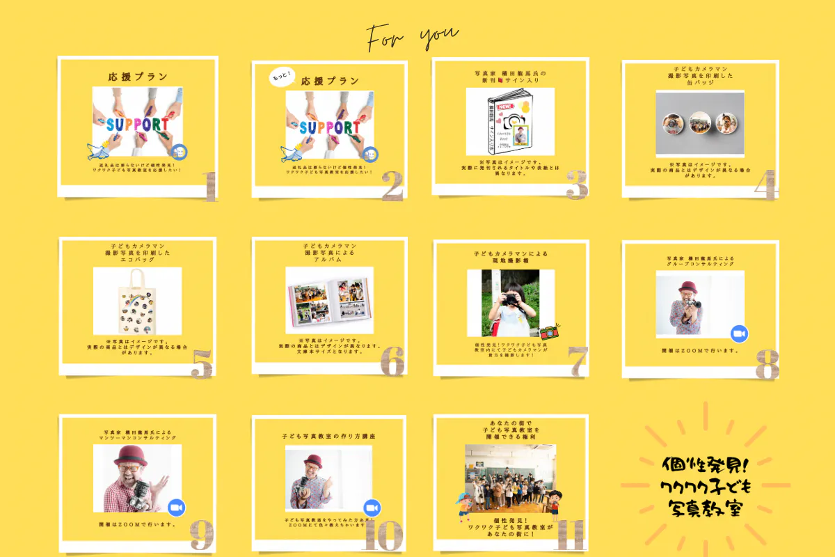 リターンはこの活動をあなたの町で開催できる特典や、カメラマンを目指す人のためのコンサルティング、記念グッズの他、子ども達からのメッセージやありがとうが詰まったものをご用意致します。