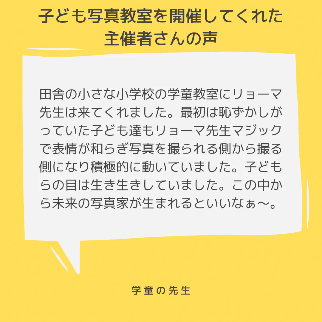 写真を撮ることで、こんなにも沢山の良いことがあるのにこどもが写真を撮らないのなんて、もったいなすぎます。私は自分の人生をかけて、この最高のコミュニケーションツールである写真を、一人でも多くの子ども達に伝えていきたいと思っています。