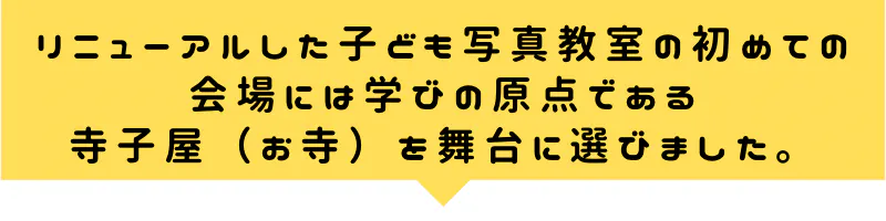 どんな環境の子ども達にも無料で、学校では教わることができない究極のコミニュケーションの仕方や、写真の魅力を、学びの原点である寺子屋(お寺)という場所からここでしか出来ない、心に一生に残る活動として想いをひとりでも多くの方々に届けたい!