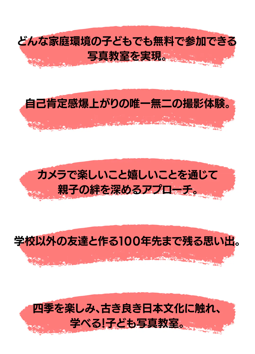 子ども写真教室でチャレンジ精神、褒める力、個性を伸ばしたり発見したりという経験が、子どもたちが大人になった時、日本が今よりも素敵な未来になっていると私たちは信じています。
