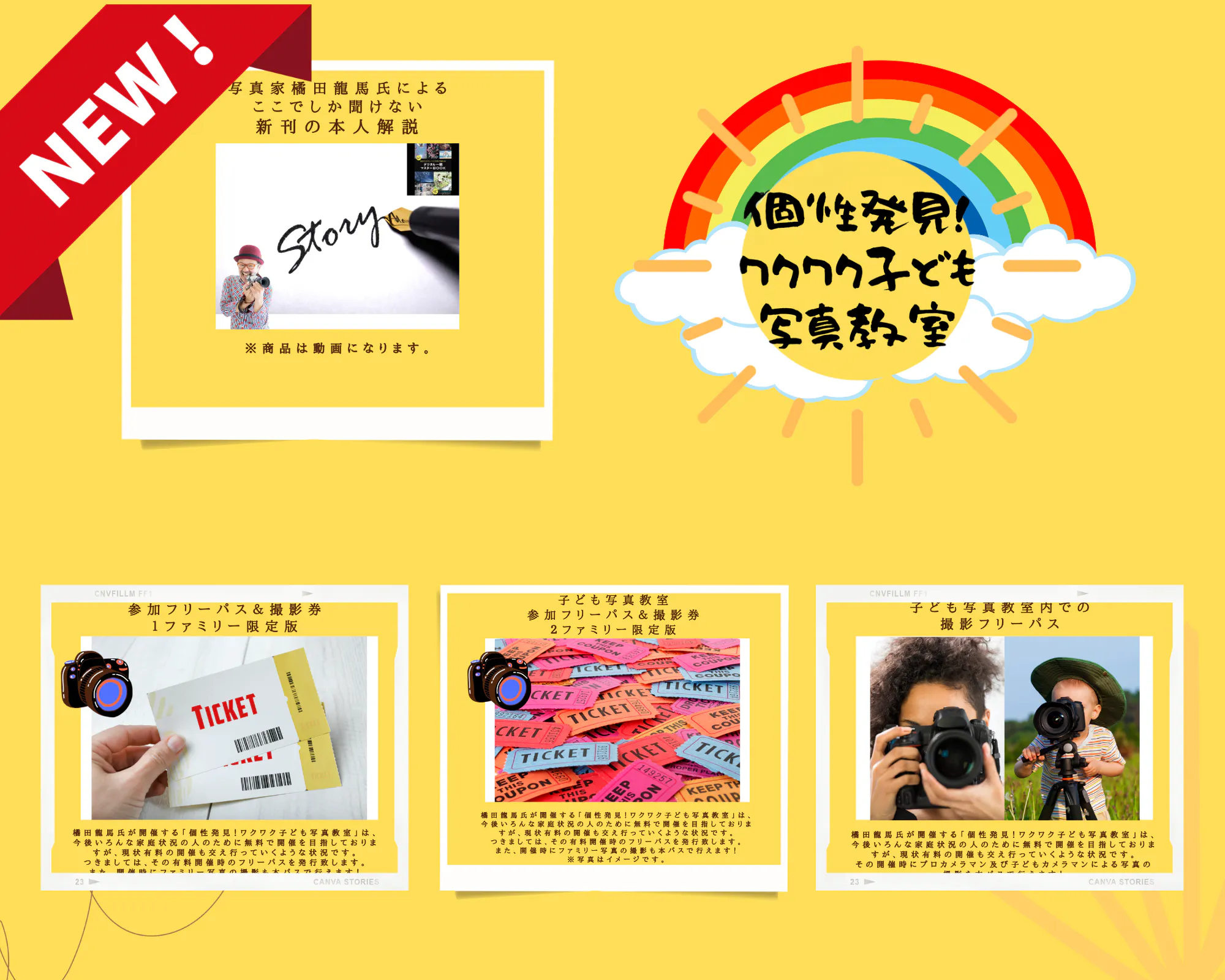 橘田龍馬氏が開催する「個性発見!ワクワク子ども写真教室」は、今後いろんな家庭状況の人のために無料で全国開催を目指しておりますが、現状有料の開催も交え行っていくような状況です。つきましては、新しい返礼品として、有料開催時のフリーパスを発行致します。また、開催時にファミリー写真の撮影も本パスで行えます! お子さんがいらっしゃる方、お子さんが大きくなっている又はいらっしゃらない方でもお得な内容となっております。 また子ども写真教室内での撮影パスも新しい返礼品として追加いたします。こちらは制限人数内であればお友達と子ども写真教室を見学しにきて撮影するもよし、親と来るもよし祖父母と来るもよしと言った内容となっております。
