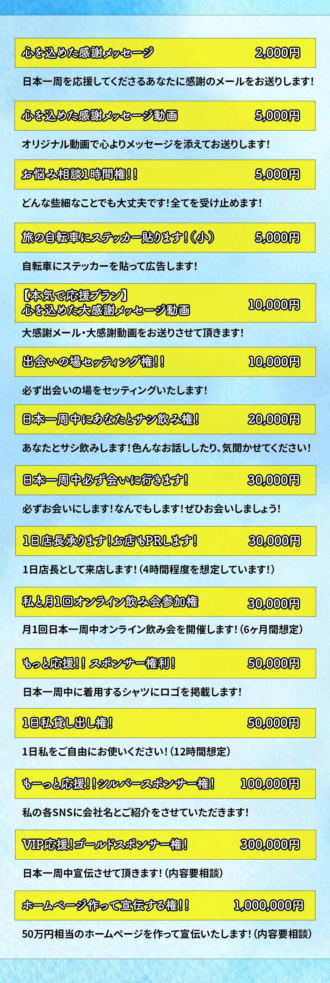 また、出発までにお時間がありますので、いろいろな県に伺い商店街や栄えているとこでチラシ配りをして周知していきます!