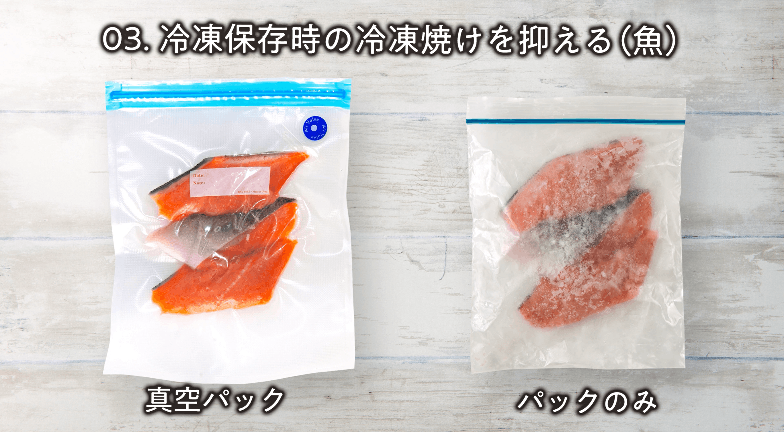食品を真空パックにしてから冷凍保存にすることで、食品の乾燥や酸化を防ぐことができ、冷凍焼けや霜の発生を防いで食品を長く保存できるようになります。