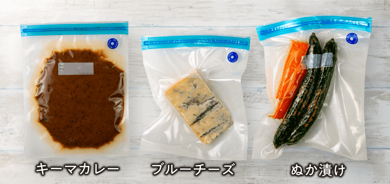 キーマカレー、ブルーチーズ、ぬか漬けなどは他の食材に匂いが移りやすく、冷蔵庫内の匂いも気になるので保管に困るものです。真空パックなら密閉率が高いので安心です。