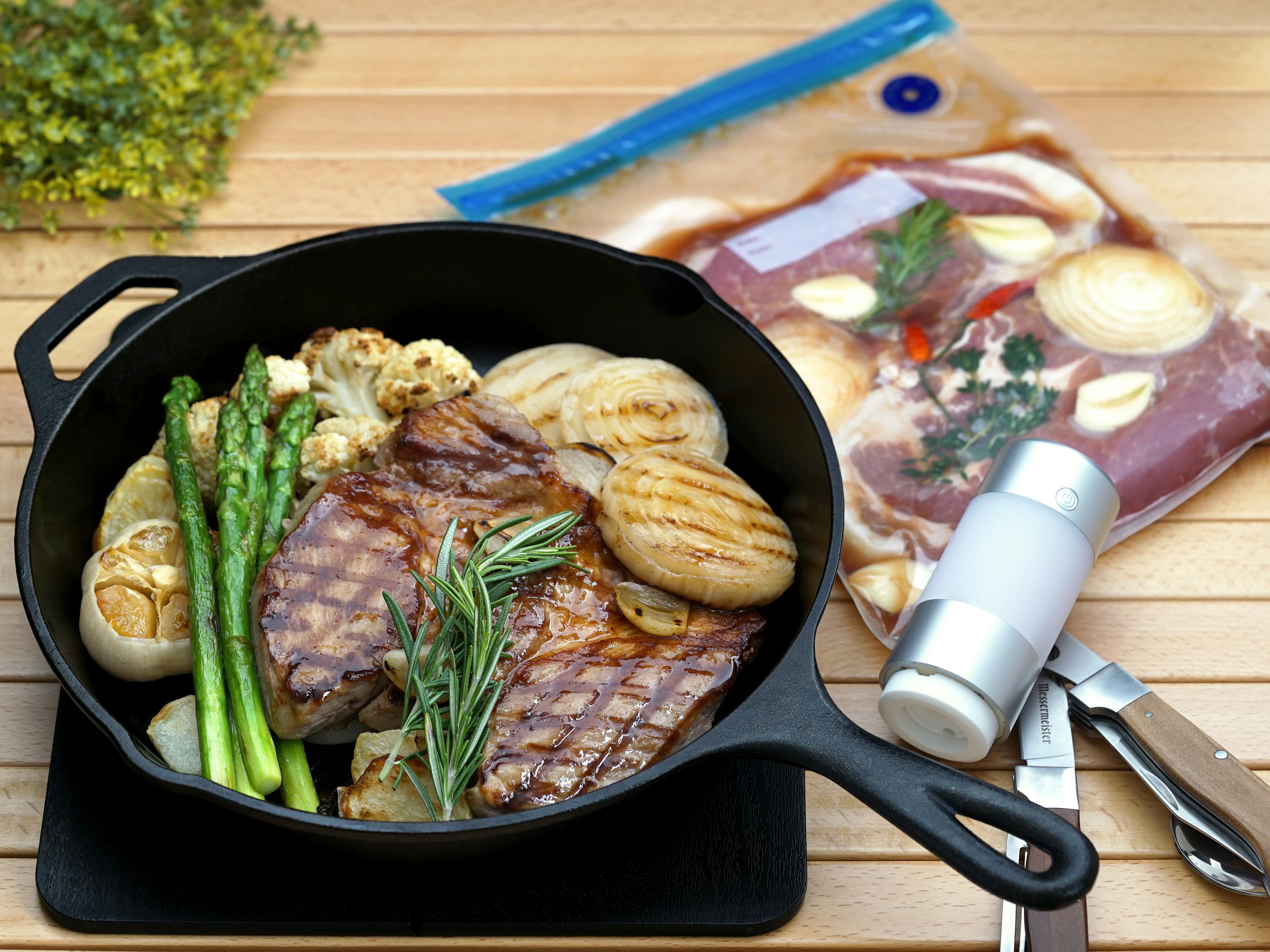 真空パック:厚切りのステーキ用豚肉、酒、みりん、しょうゆ、ニンニク等