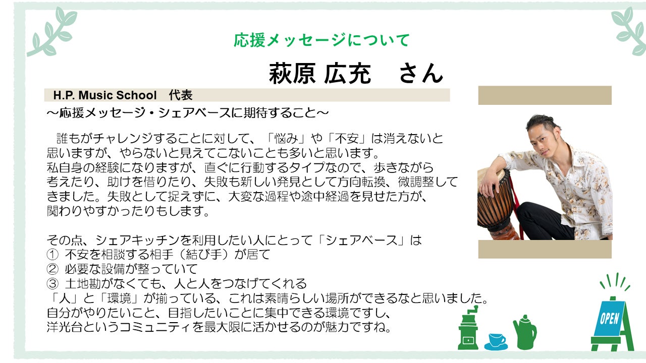 事業を回しながら、まちと人の接点を作るシェアベース、完成を今から楽しみにしております。応援しています!