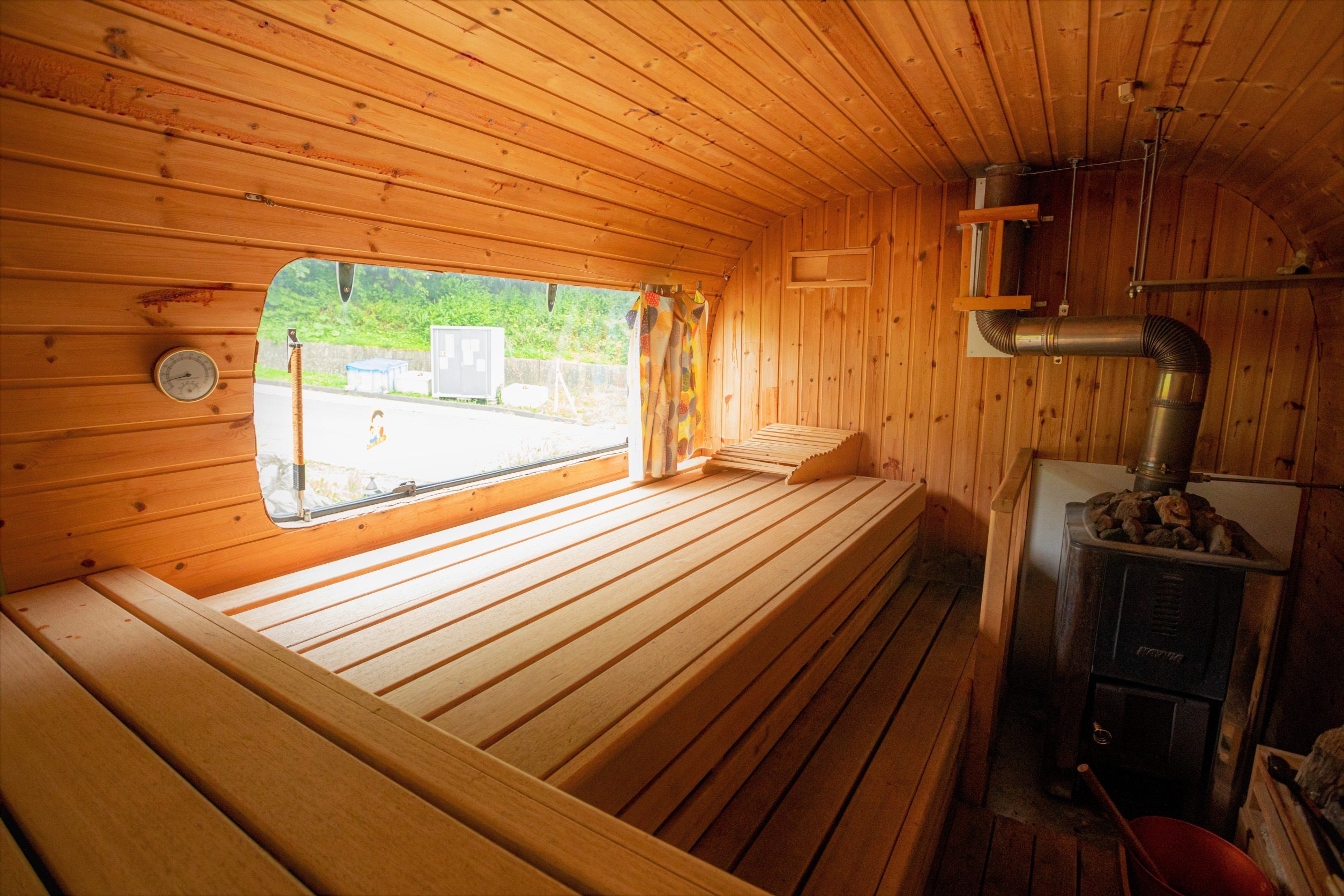 つなかん名物サウナトースター。宿泊者限定の時間貸切制となっています(要予約)。HARVIA製の薪ストーブで自分たちの好きな温度に調節可能。もちろんセルフロウリュも可。