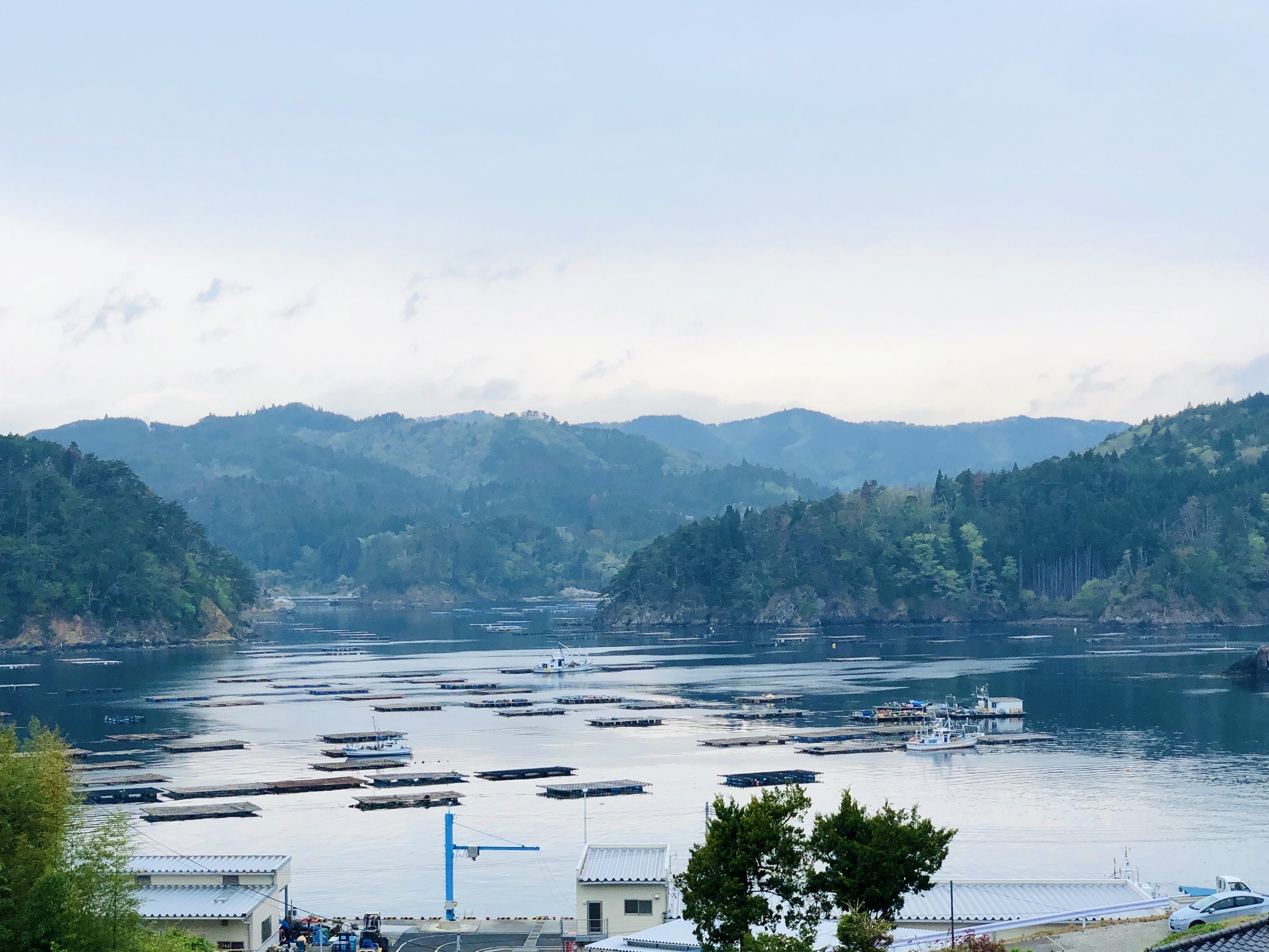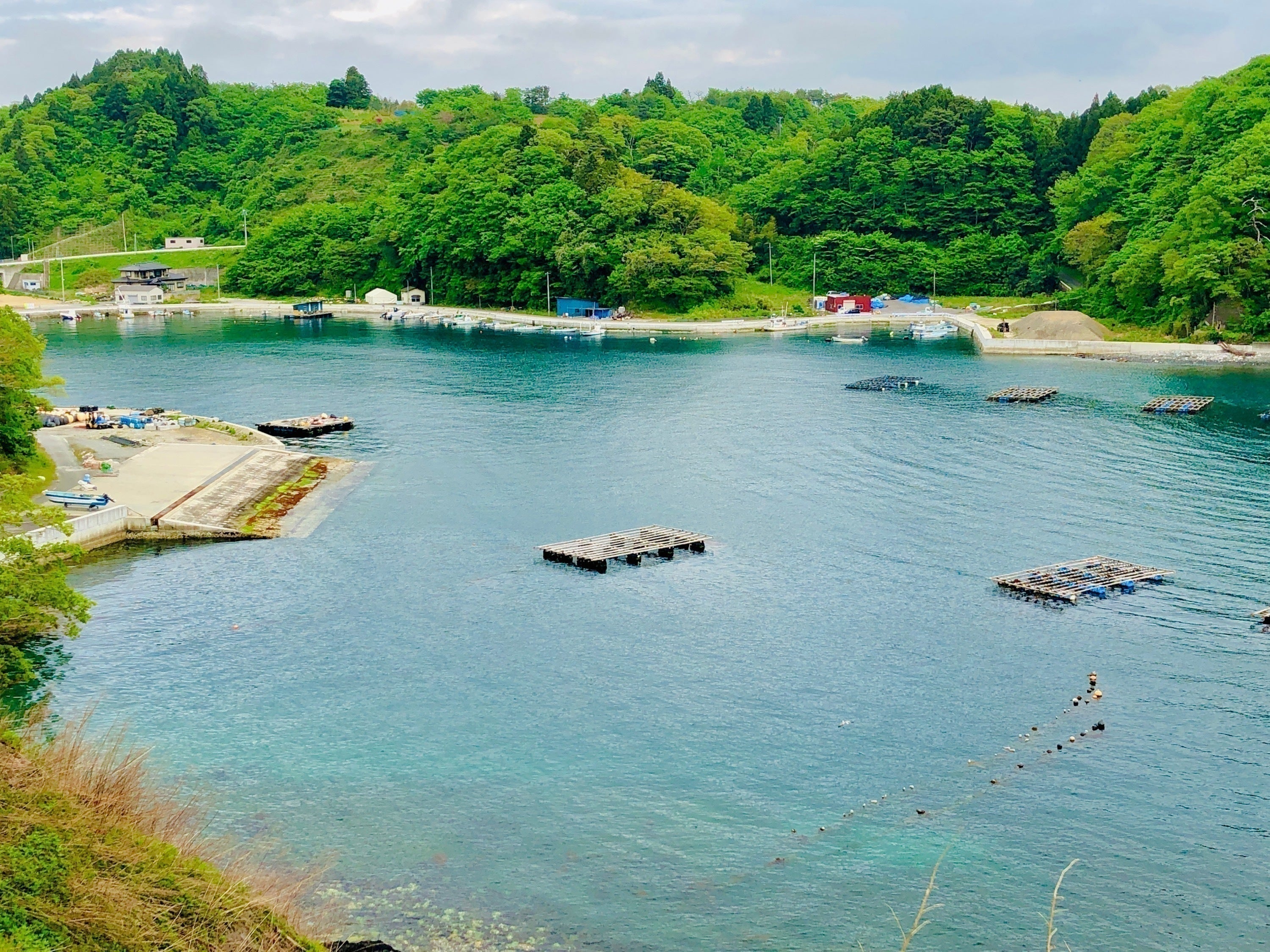 目の前に広がる鮪立湾。唐桑町はリアス式海岸特有の複雑な入り江や岸壁の景観、牡蠣やほたての養殖筏がたくさん並び、ゆったり穏やかな海に癒されます。