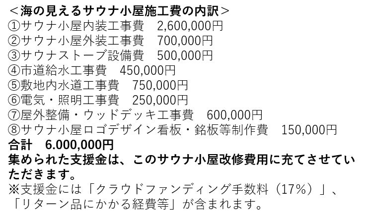 こちらからクラファン手数料等をひいた分がサウナ小屋施工費に充てられます。