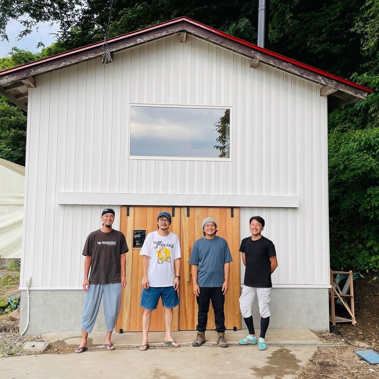 こちらはサウナのデザインと施工をしてくれた東北ツリーハウス観光協会の斉藤道有さんとアフロ巧業のみなさん!