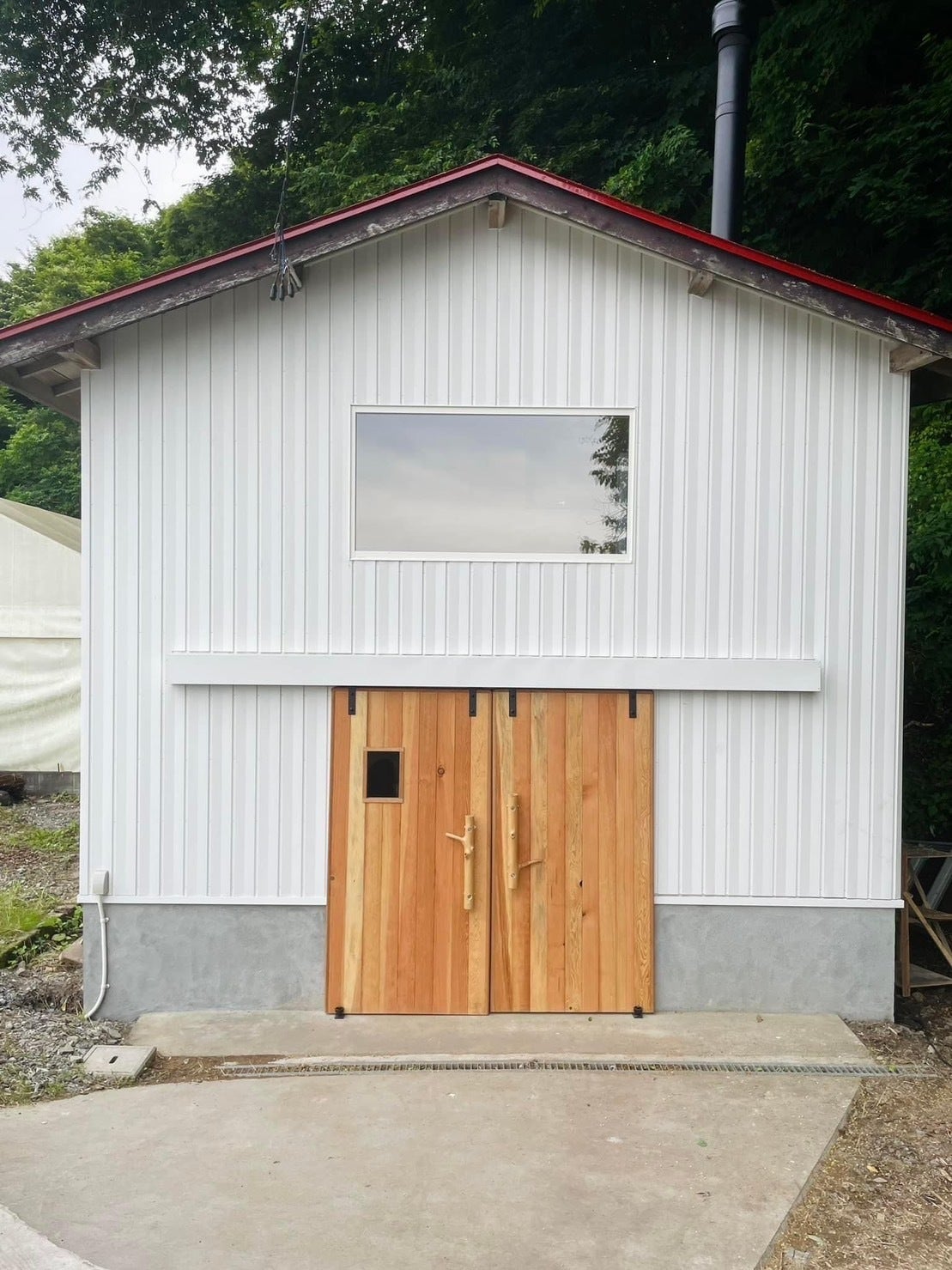 もともとあった資材小屋をそのままいかしたデザインです!入口のドアも手作りとなっています。新たに開口した正面の大きな窓がサウナ室の窓です!