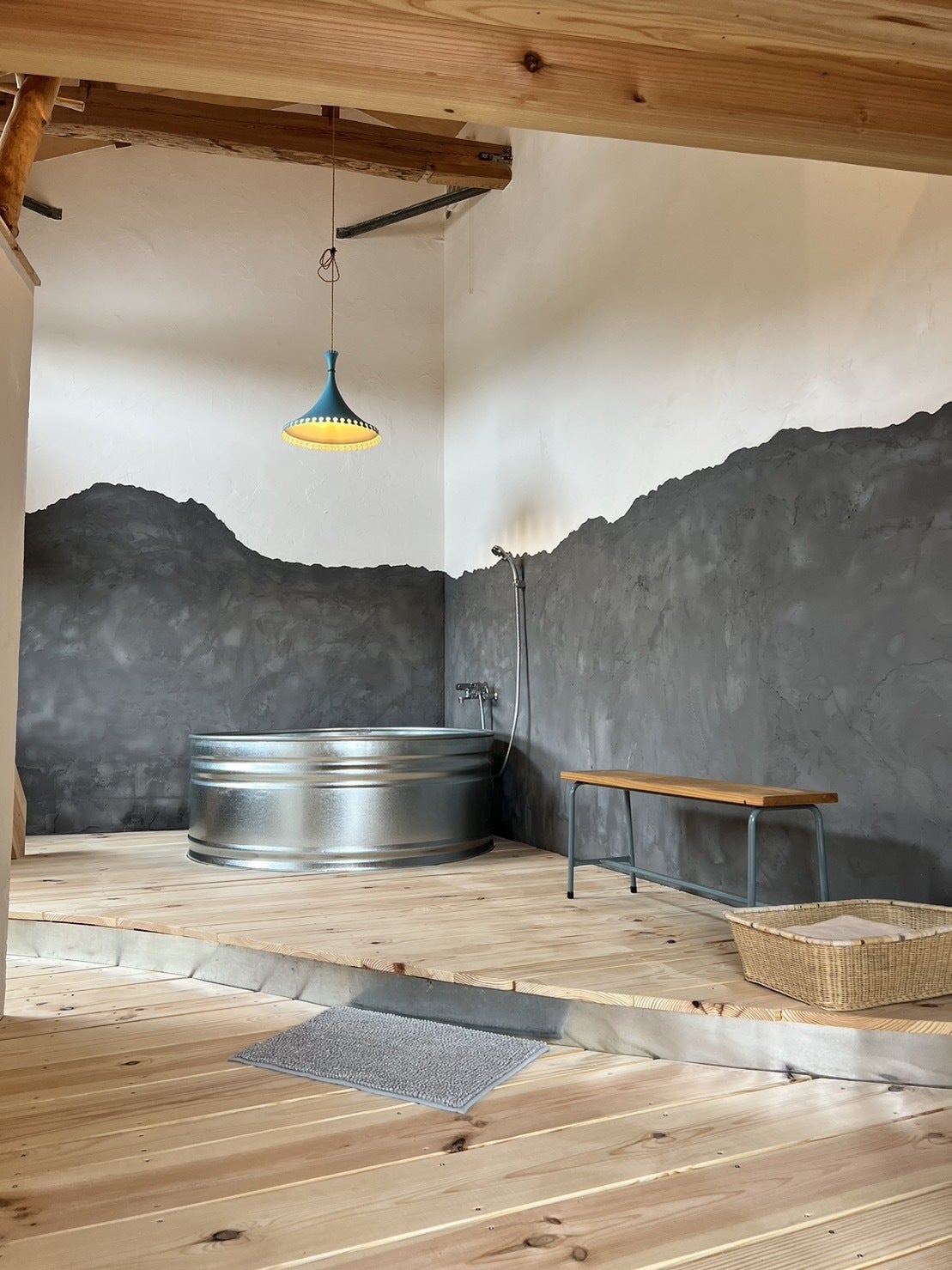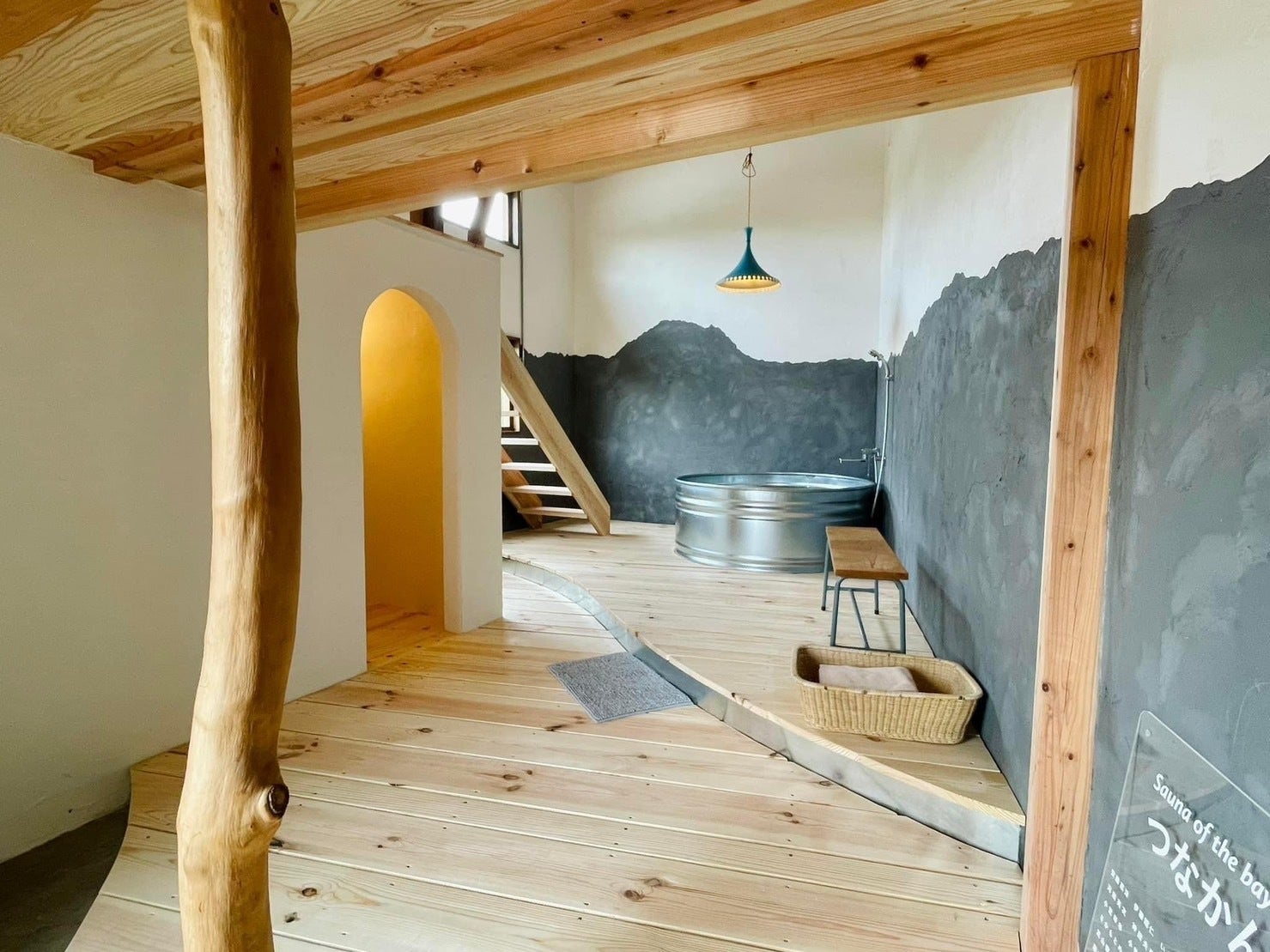 壁は漆喰を使って鮪立湾の海上から見た山の稜線が描かれています。床の柔らかい曲線や自然の木の形のままの柱などが外の景色とつながるようなデザインです。