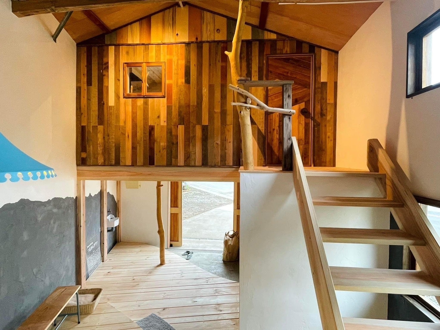 階段を上がった先にあるのがサウナ室になります。サウナ室の外壁やドアなどは数種類の樹種の古材を使って張り合わせてあり、ツリーハウスのようなもう一つの小屋が建っているようです。