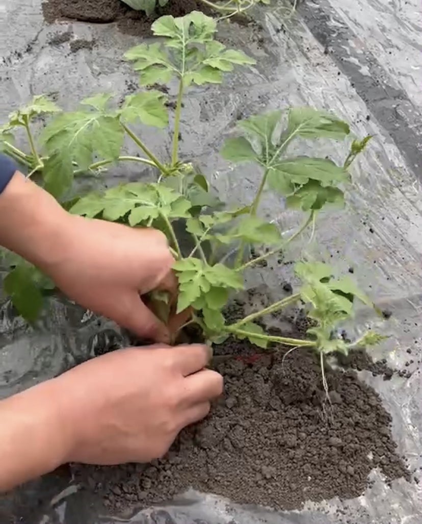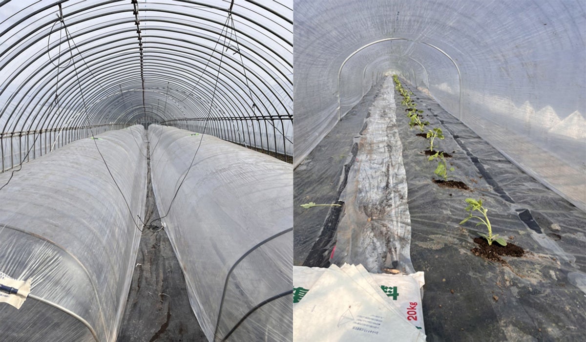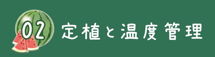 北栄町では、3月1日に生産農家が一斉に定植作業をスタートさせます。まだまだ寒い鳥取県の春ですが、ビニールハウスの中にさらにトンネルを作ることで地熱と湿度を保ち、苗の活着を促します。この瞬間からハウス内の温度管理が始まるため、農家は温度計や天気を見ながら1日何回も温度調節をして適温を保つよう努力します。温度管理に失敗すると、質の良い雌花や雄花が咲かないため、美味しいスイカを作るにはこの温度管理が重要になってきます。我が家はハウスが40棟あるので夫はこの時期になると痩せます。(私はなぜか痩せません…)