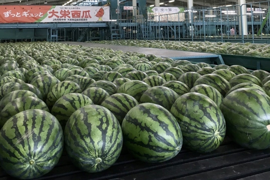 鳥取県と言えば砂丘と20世紀梨のイメージを持たれる方が多いかもしれませんが、スイカの名産地でもあるんです。全国トップクラスの生産量を誇り、中でもここ北栄町(旧・大栄町)は最も生産量が多く認知度も高い産地です。鳥取県が誇る霊峰大山山麓の豊かな土壌(黒ボク)で育ち、大玉で糖度が高くシャリっとしっかりした食感が特徴です。山陰地方はその名称から日照時間が短いと思われがちですが、それは冬の話で、スイカ栽培が始まる春は晴れの日も多く日照量にも恵まれています。日本最大のスイカの産地・熊本と比べても4〜6月は鳥取の方が日照時間が多くなっています。日照時間が多いと光合成が盛んになり、でんぷんが多く作られます。そのでんぷんが糖に変わり、糖度の高いスイカができるのです。